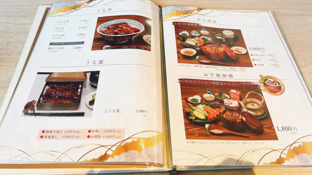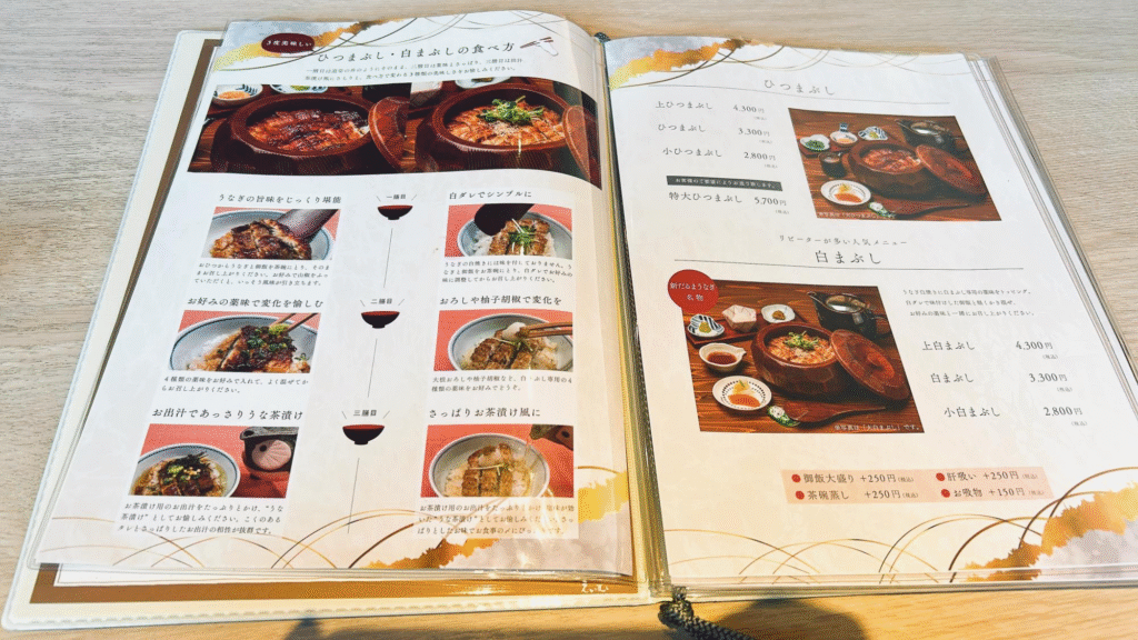 ひつまぶし、白まぶし、うな丼、うな重などに加えて、お子様御膳や数量限定のお得なメニューも用意されています。