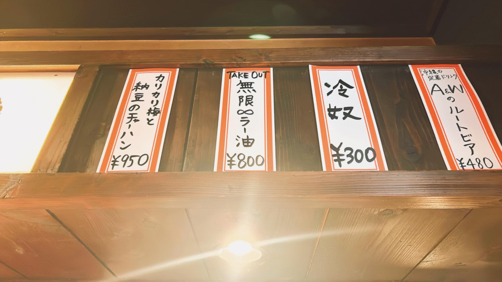 中華料理店でありながらも、沖縄を感じられる調味料もテーブルには用意されています。
