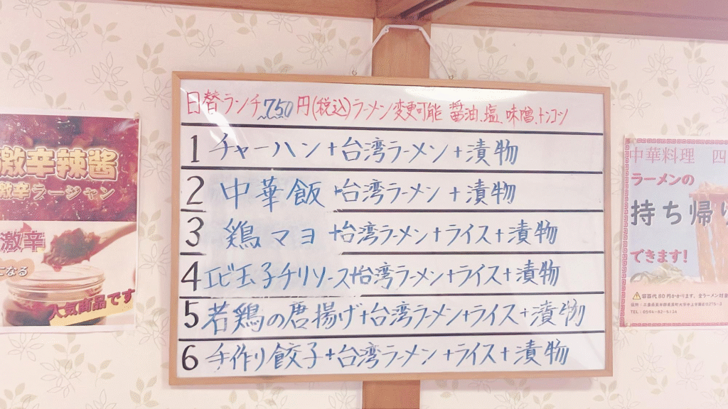 選べるメインと台湾ラーメン(ラーメン変更可)、お漬物がセットになったお得なメニューで、見渡す限りランチを注文している方がほとんどのようでした。