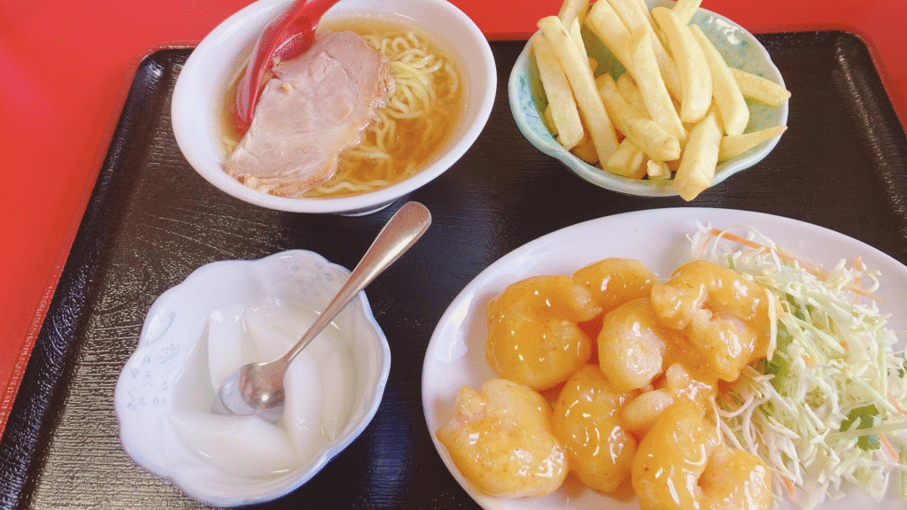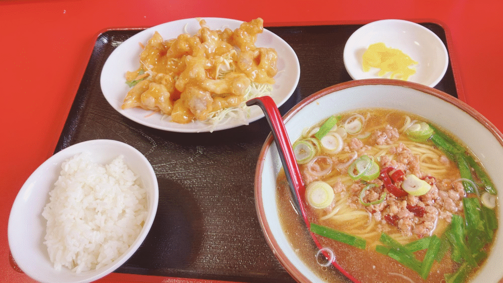 揚げ物もボリューム満点、台湾ラーメンはあとから少しピリッと感じる程度で小学生でも食べられる辛さです。