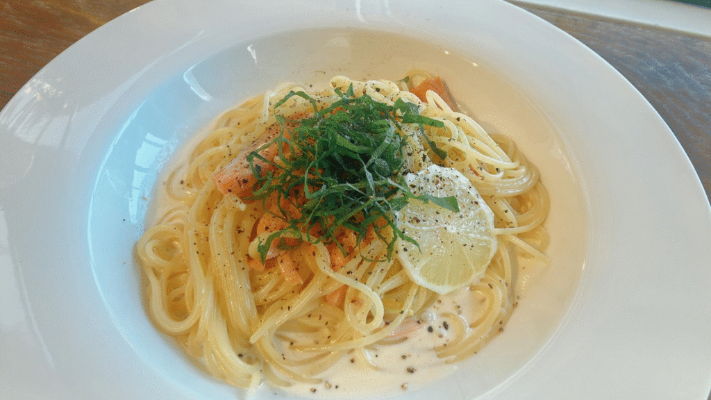 この日のパスタはスモークサーモンのレモンクリームでした。
