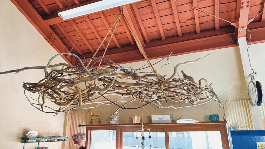 不思議な形の木でできたライトは手作りなのだそうですよ。