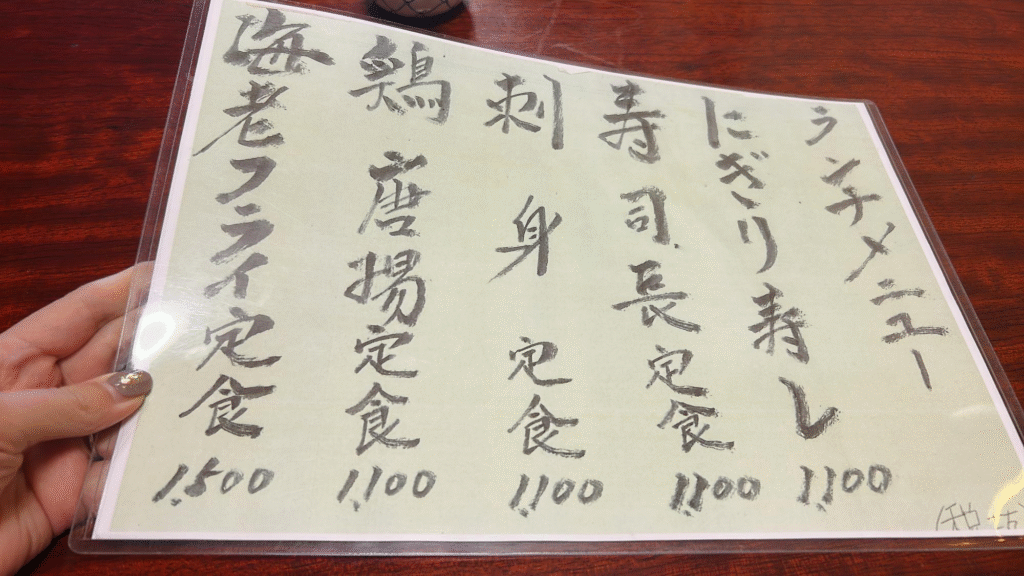 1100円(税抜)から寿司ランチが楽しめるほか、お刺身や唐揚げの定食も用意されています。