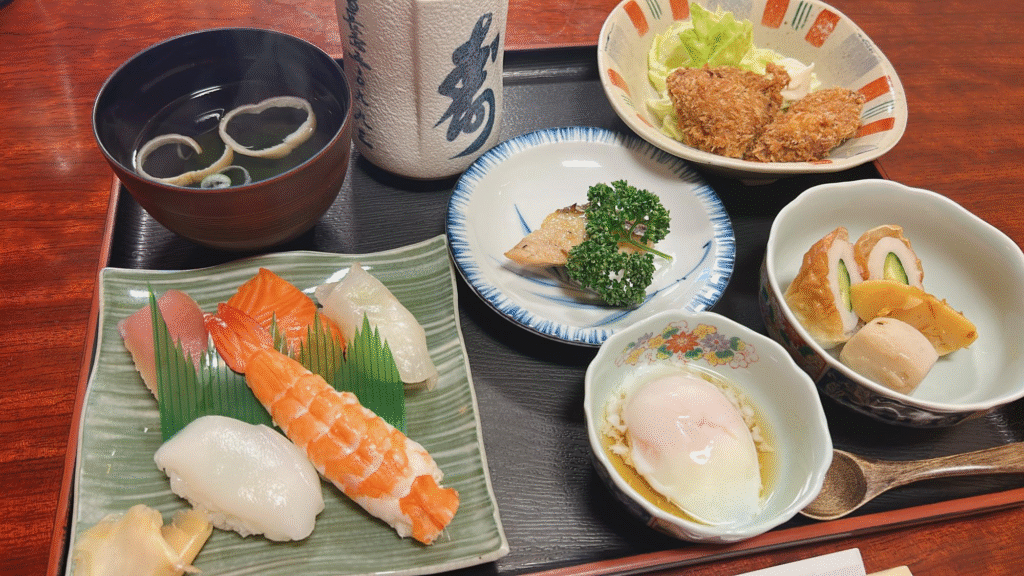 寿司5貫のほか、焼き魚や揚げ物、小鉢までついて満足度が高いですね。