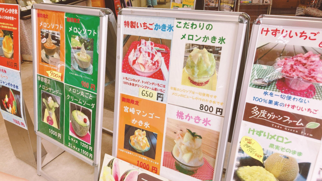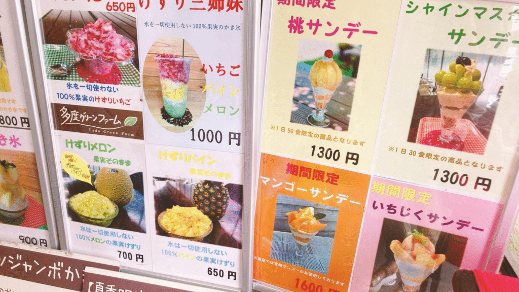 フルーツをたっぷり使ったサンデーやかき氷・けずり果実の種類が豊富でどれも食べてみたいなとワクワクします。