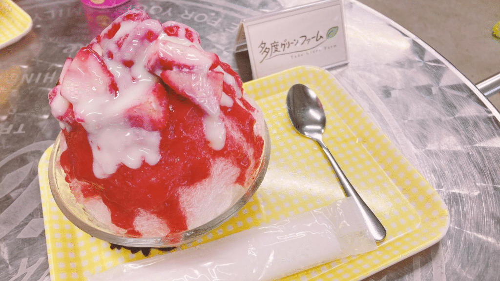 たっぷりの濃厚いちごソースといちご、練乳がかかった贅沢な一品でとてもおいしいかき氷でした。