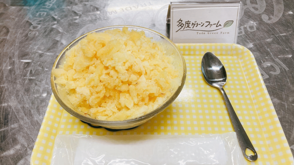 凍らせたパイナップルを削ったもので、氷は使われていない果実100%でできています。
