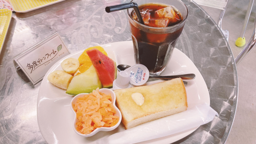 選べるドリンクにトースト・果物・けずりメロンがついて500円とお値打ちだと思います。