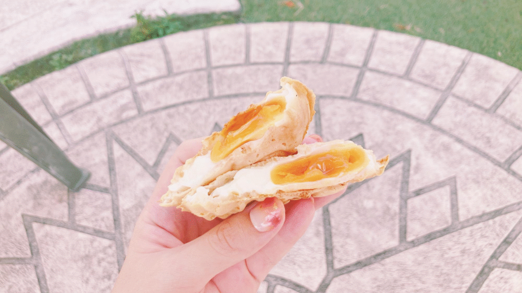 ワンハンドで目玉焼きが食べられるような不思議な感覚ですが、軽食やおやつにピッタリでとてもおいしかったです。