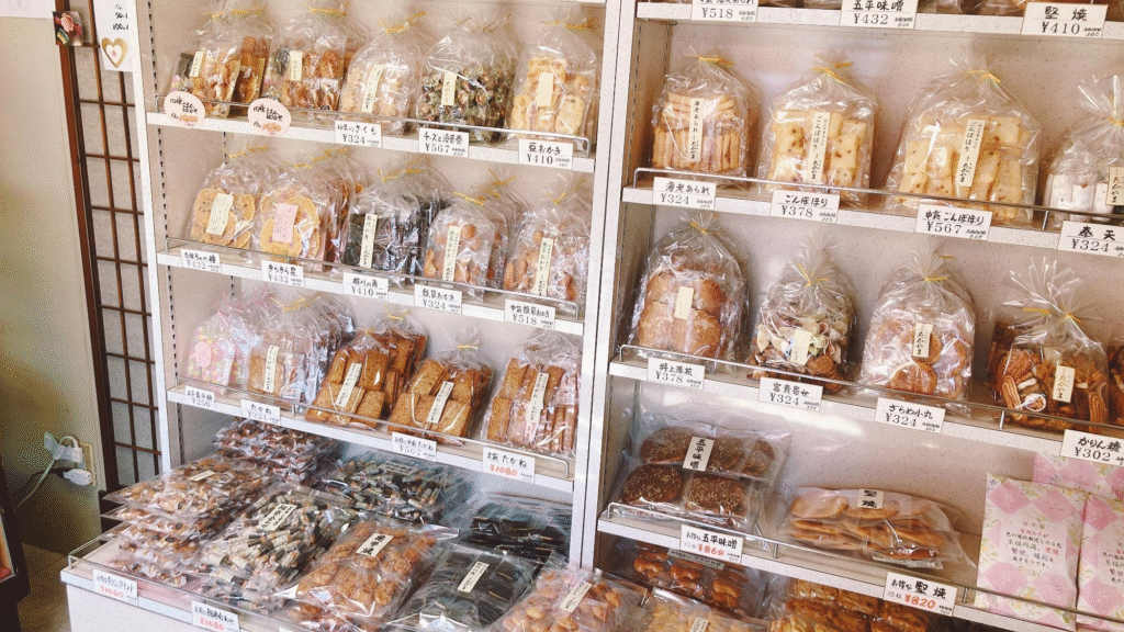 様々な種類のおせんべいが売られていて、どれがおすすめですかと聞いてみましたが全部!とのお返事が面白かったです。