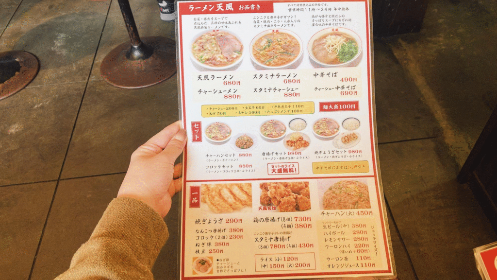 看板メニューの天風ラーメンは白菜と豚肉たっぷりで甘みのあるスープが特徴で、スタミナラーメンはにんにくと唐辛子が効いたガツンとした味わいが人気です。