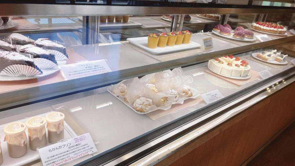 ショーケースには種類はそれほど多くないものの、おいしそうなケーキがずらりと並んでいます。
