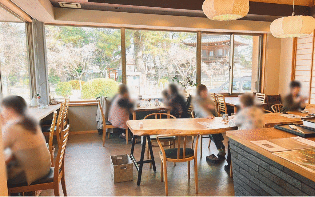 明るく広々とした店内で、大きな窓からはお寺を一望できます。