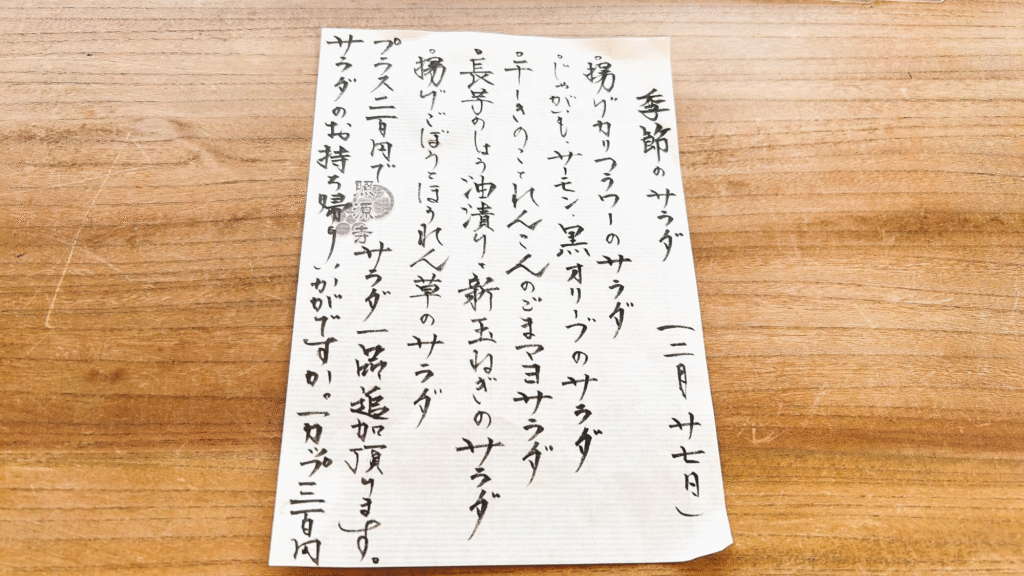 基本は1品ですが、プラス料金でサラダの追加ができるほか、サラダのテイクアウトもできますよ。