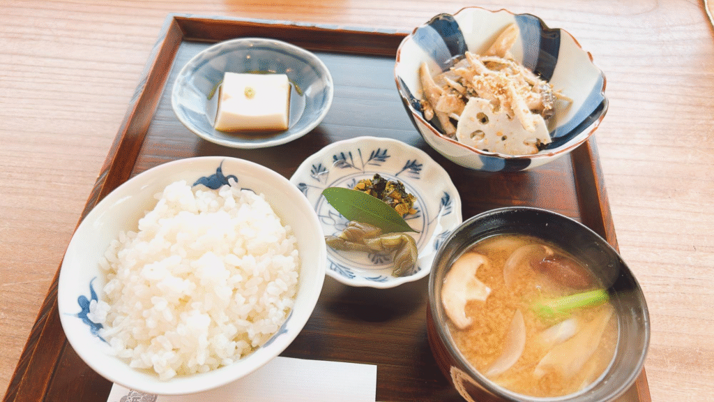 出汁の効いた具沢山のお味噌汁や濃厚な胡麻豆腐がおいしいです。