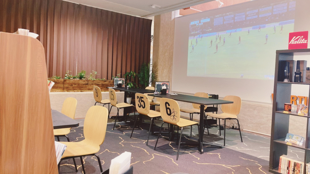 背番号が書かれた椅子にサインが書いてあったり、大きなスクリーンで試合の様子が映し出されていたりとファンにとって嬉しいサービスがいっぱい!
