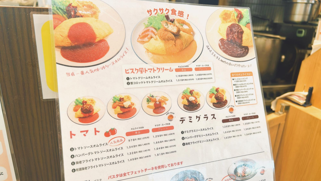 オムライスはトマトソース、デミグラスソースが選べるほか、ハンバーグ乗せ、エビフライのせなど豪華バージョンも用意されていますよ。