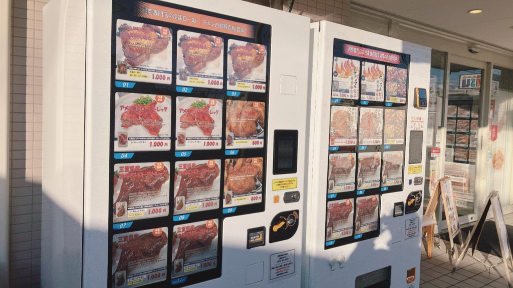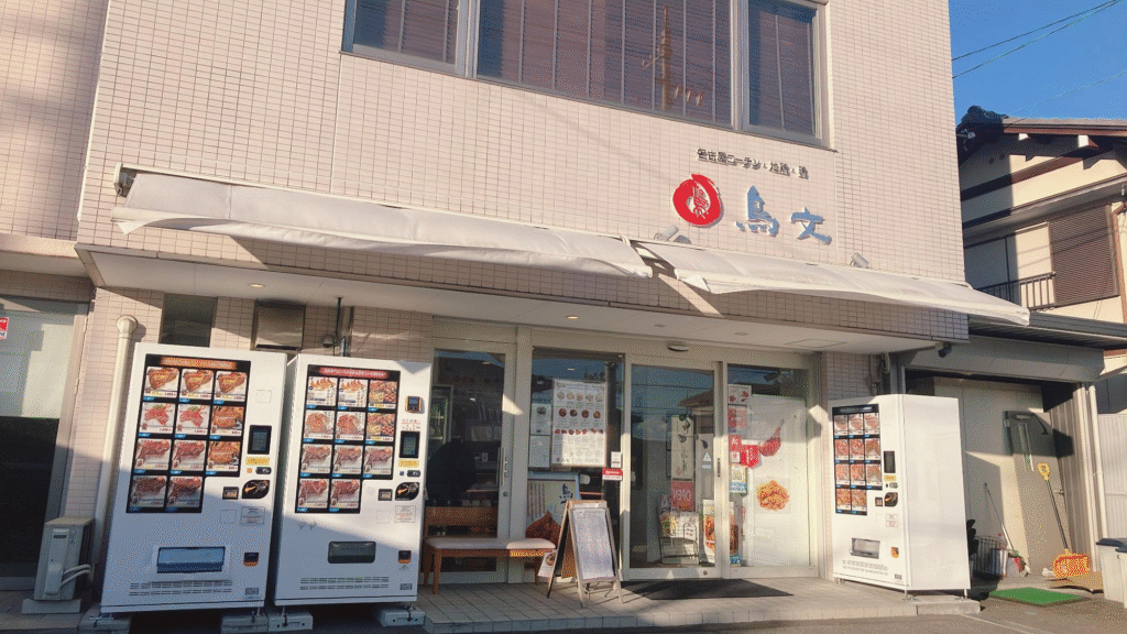 大山田にある鶏肉専門店の鳥文の前にはチキンの自動販売機が設置されています。