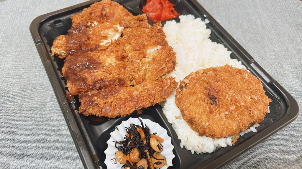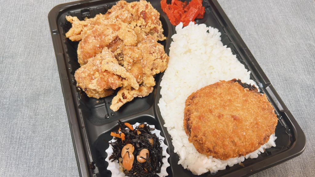 たっぷりのごはんに、揚げたてのコロッケやからあげがついてボリューム満点!