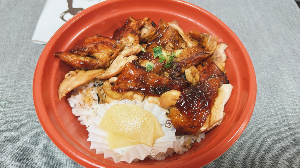 ごはんにスライスしたローストチキンがのっており、甘辛ダレでごはんが進みます。
