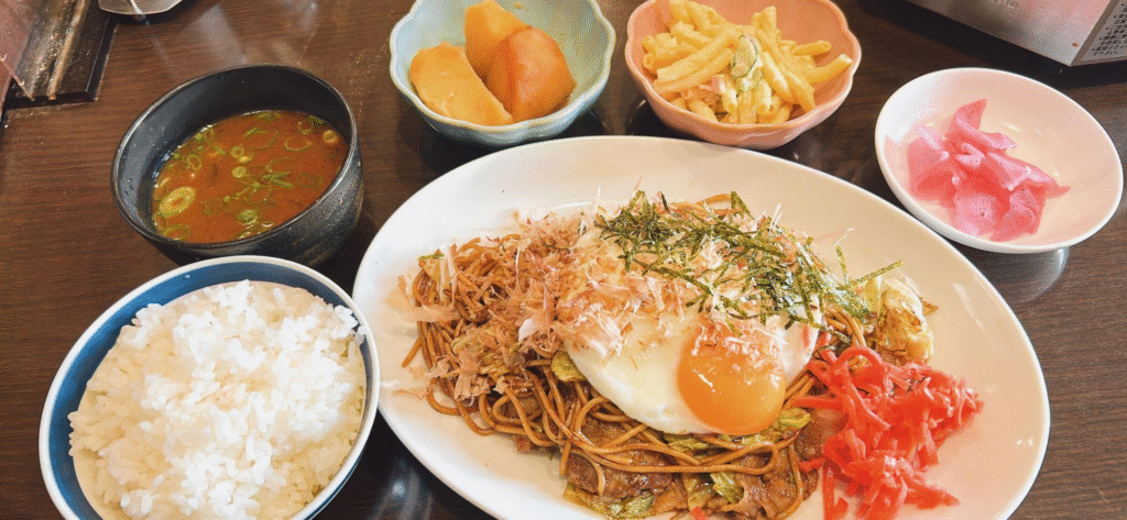 メインの焼そばに加えて、ごはんや小鉢、お味噌汁までついてボリューム満点!