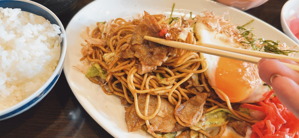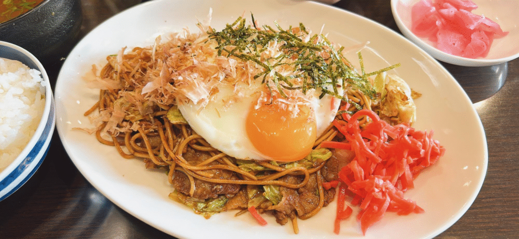 焼そばにのったとろーり半熟卵にテンションが上がります。