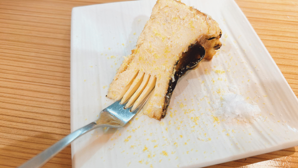 フォークをのせてみるとすっと入るほど滑らかなチーズケーキは、濃厚でレモンの風味がよいアクセントになっていました。