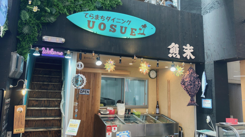 二階のてらまちダイニングUOSUEではその日におすすめの魚を使ったランチや、海鮮丼、ハワイ料理のポキなどをお値打ちに楽しむことができます。
