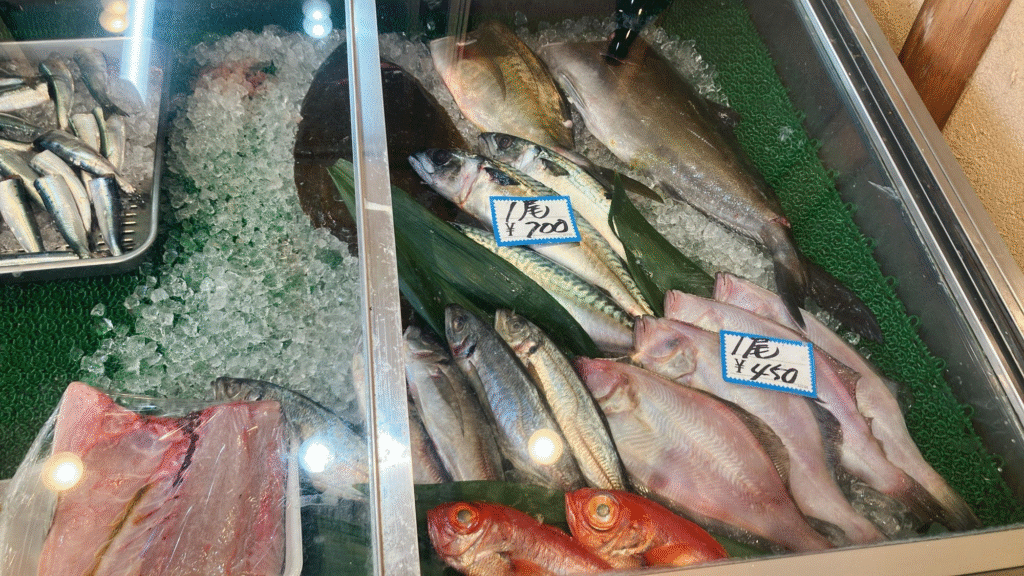 ショーケースの中には、目が透き通っていて新鮮さが伝わってくる魚がずらりと並んでいます。