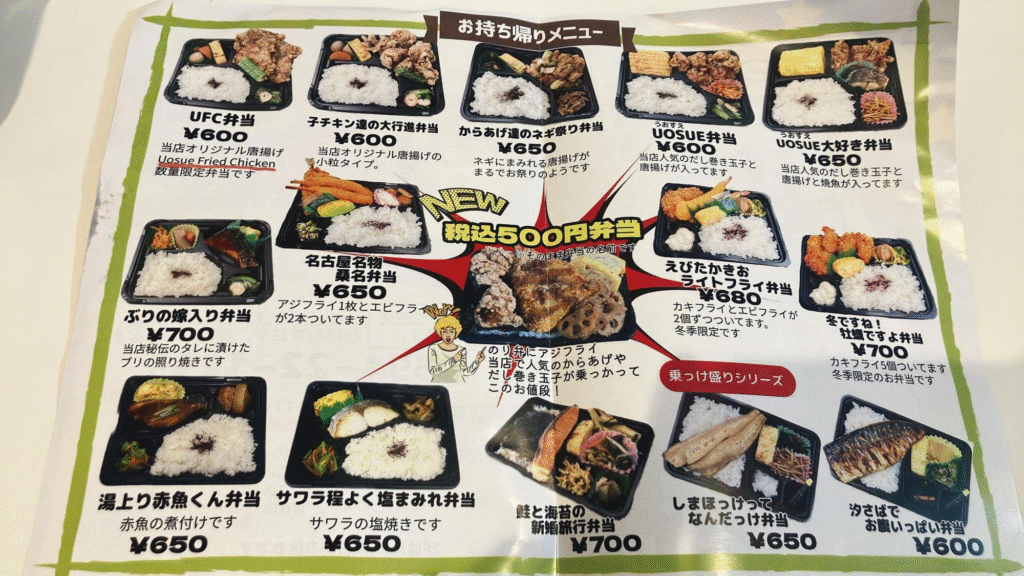 『税込500円弁当』という攻めたネーミングのお弁当が最初に目に入りますが、その他のお弁当もリーズナブルだと思います。