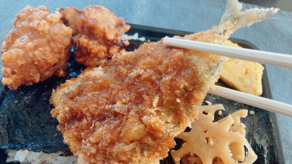 揚げたての唐揚げやアジフライがドーンとのっています。