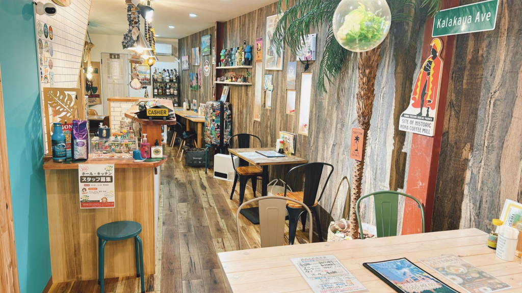 ハワイアンな店内に初めて訪れると驚きますね。