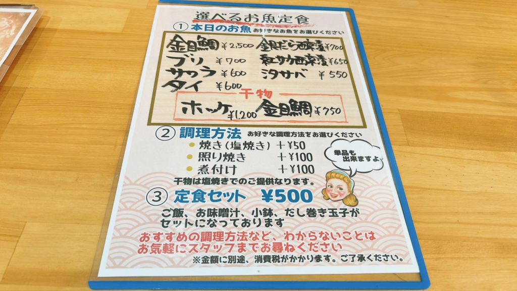 その日におすすめの新鮮な魚を使った選べるお魚定食や、選べるお刺身定食は特に人気です。