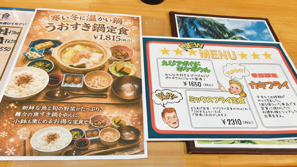 最近始まった『うおすき鍋定食』や、季節限定の『カキフライ』など、季節に合わせたメニューも並んでいます。