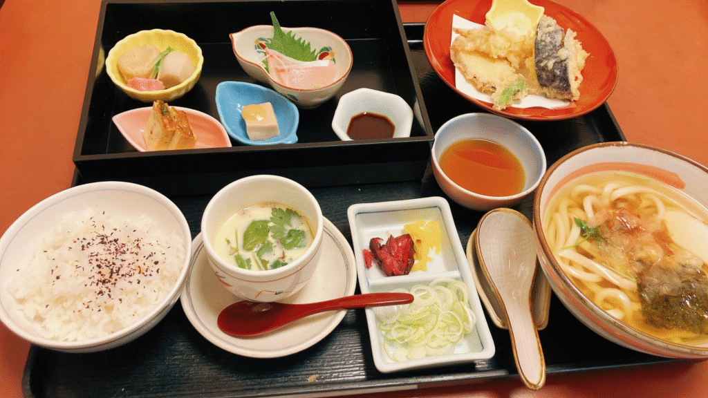 うどん、天ぷら、お刺身、小鉢、茶碗蒸しなどがついて、いろいろなものを少しずつ食べたい方にピッタリです。