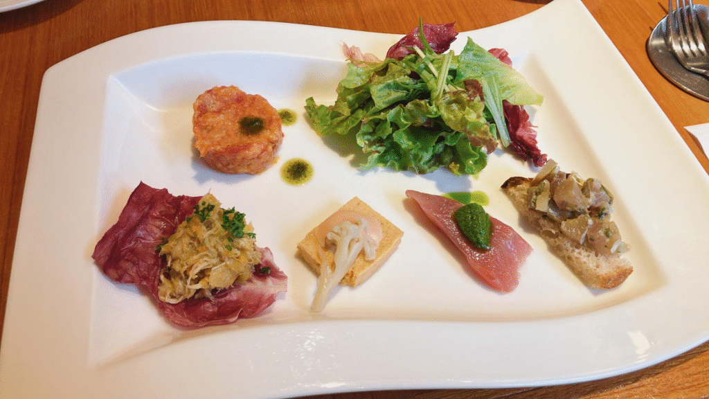 一目で手が込んでいるとわかるオシャレな前菜にワクワクします。