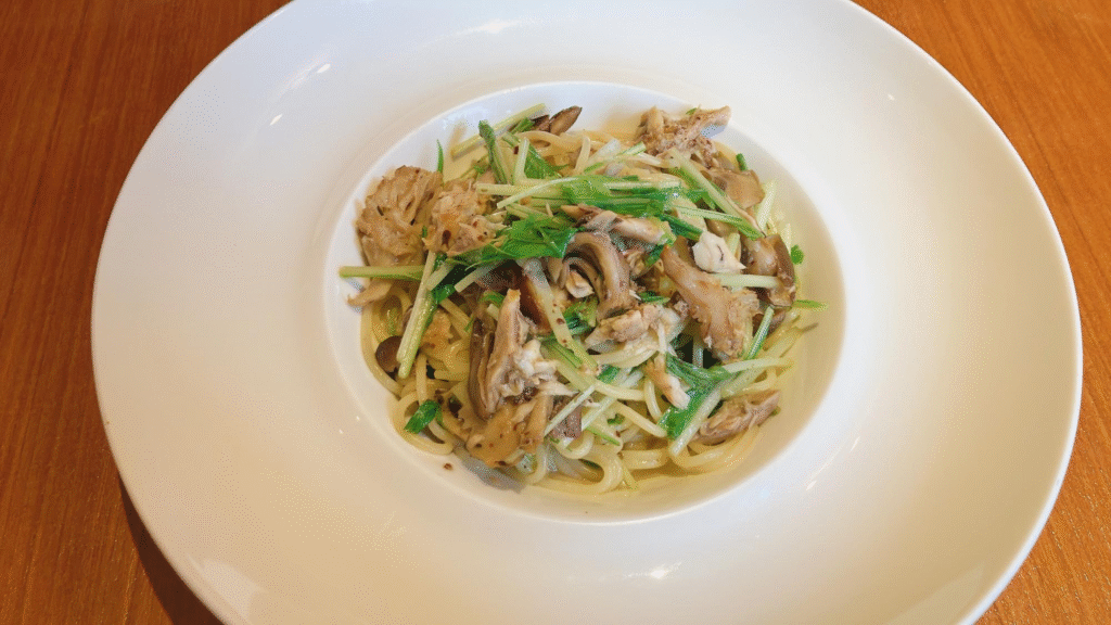 同行者がオーダーした『いろいろキノコと自家製スモーク天然魚のペペロンチーノ』です。
