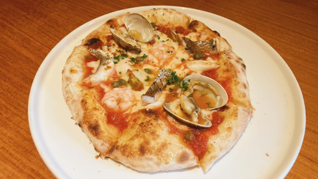 シーフードだけでなく魚がのったピザは珍しいと思いますが、トマトソースとよく合っていました。