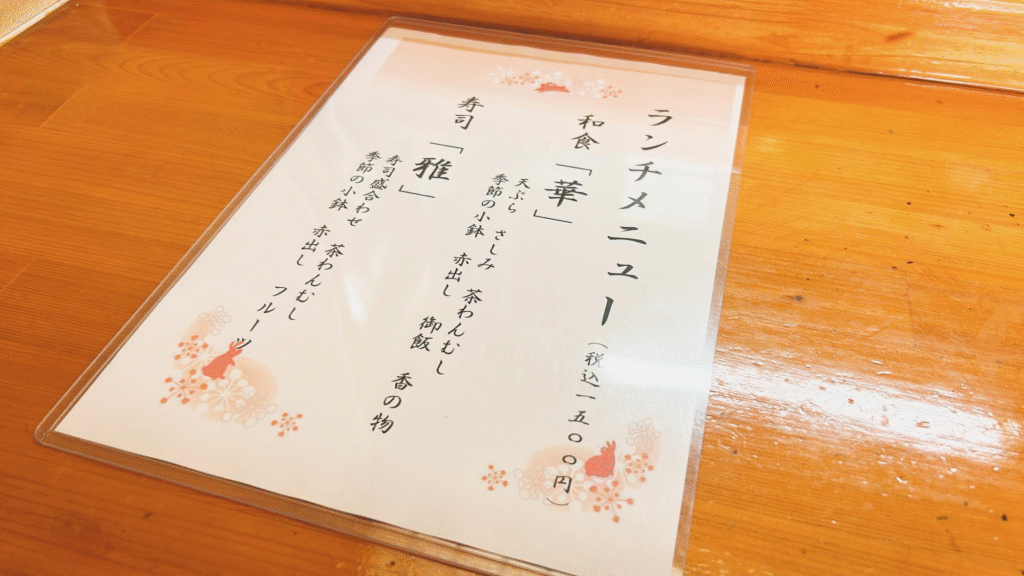 ランチは天ぷらや刺身が楽しめる和食「華」と、寿司が楽しめる「雅」の2種類が用意されており、いずれも1500円です。
