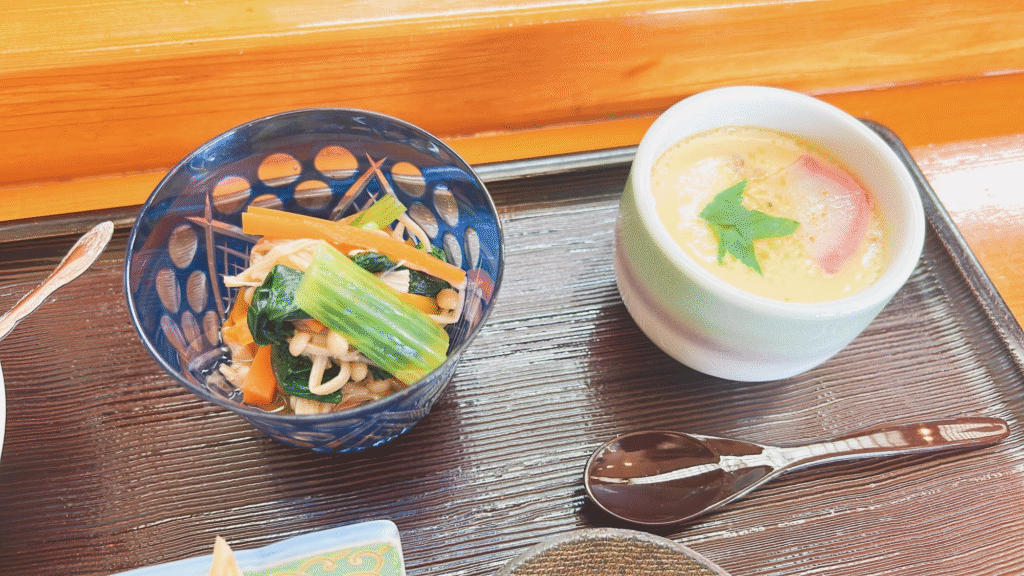 シャキシャキの食感が楽しい小鉢と、出汁の旨味にホッとする茶碗蒸しがおいしいです。
