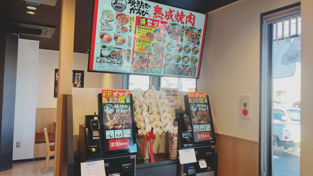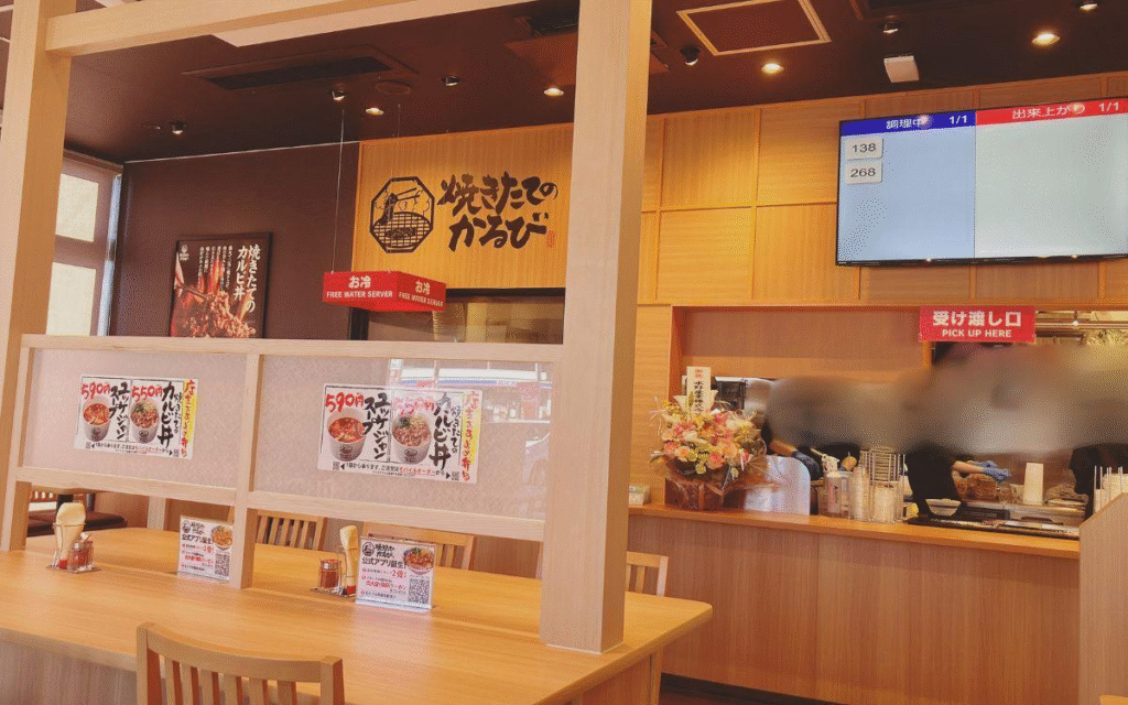 電光掲示板にレシート記載の番号が表示されたら取りに行くセルフ方式となっています。