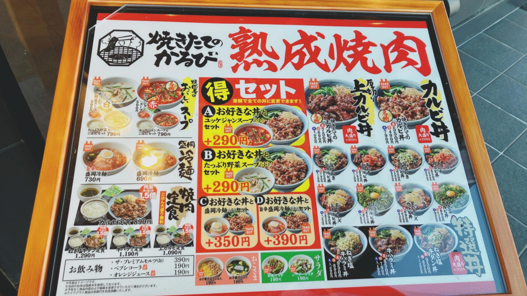 看板メニューはカルビ丼とユッケジャンスープの様子ですが、定食や子供向けメニューもありました。