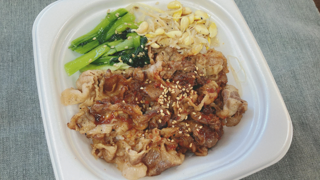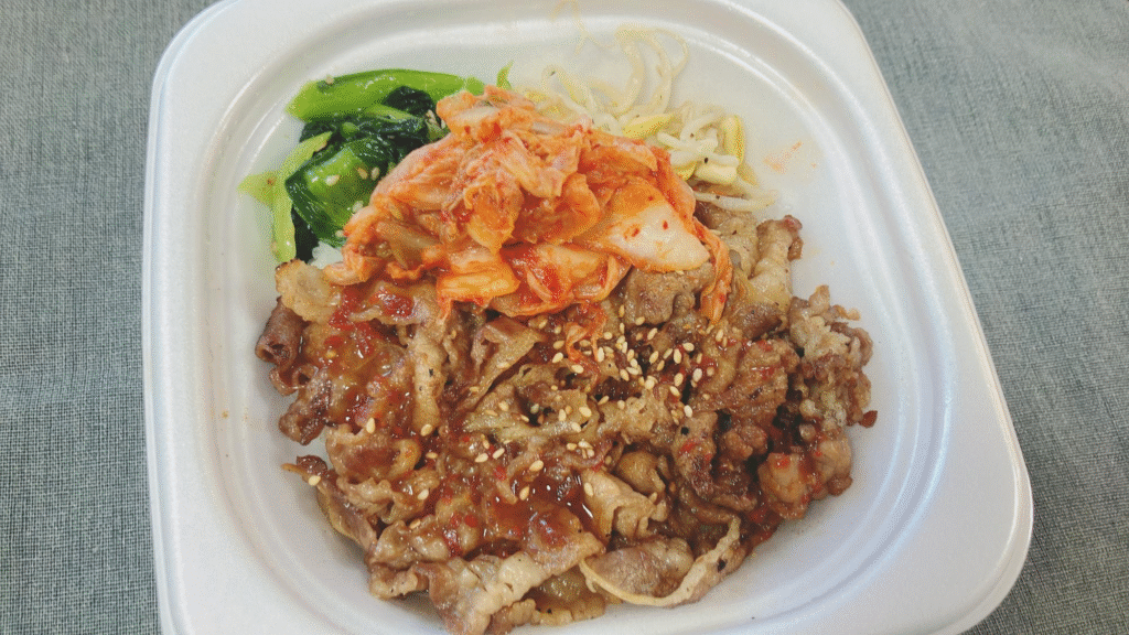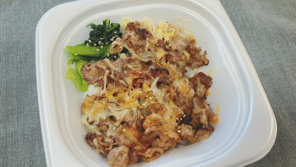 キムチカルビ丼は旨辛のキムチがのっていて、さらにご飯が進む味わいになっています。