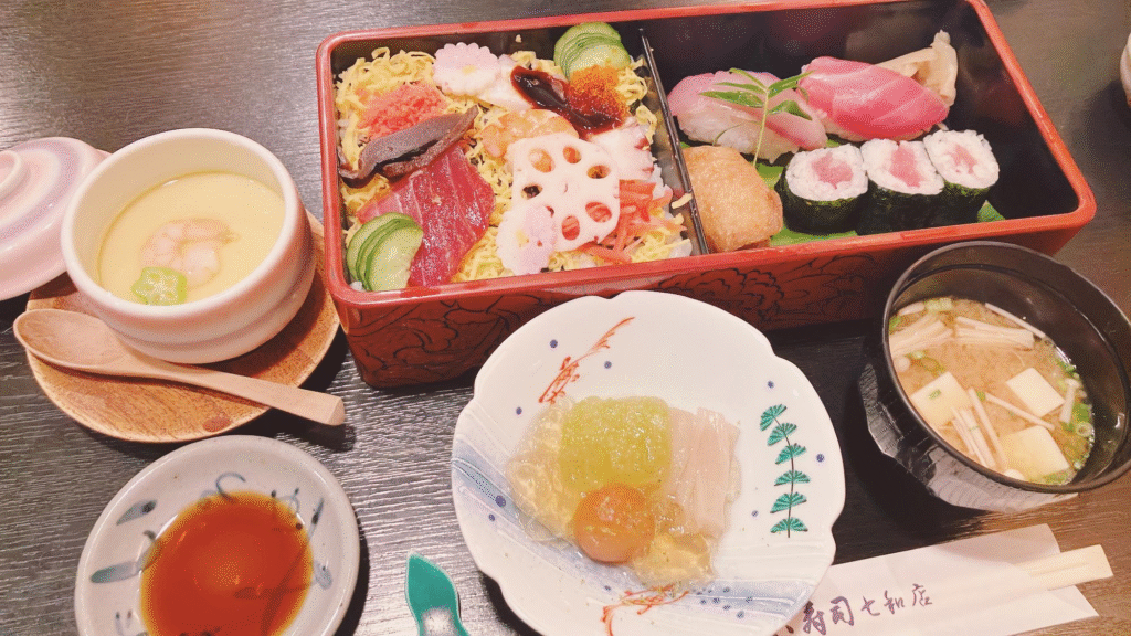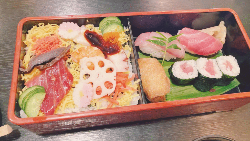 錦糸卵の上にきれいに盛られた具材が華やかで、一つ一つ丁寧に作られていることが感じられます。