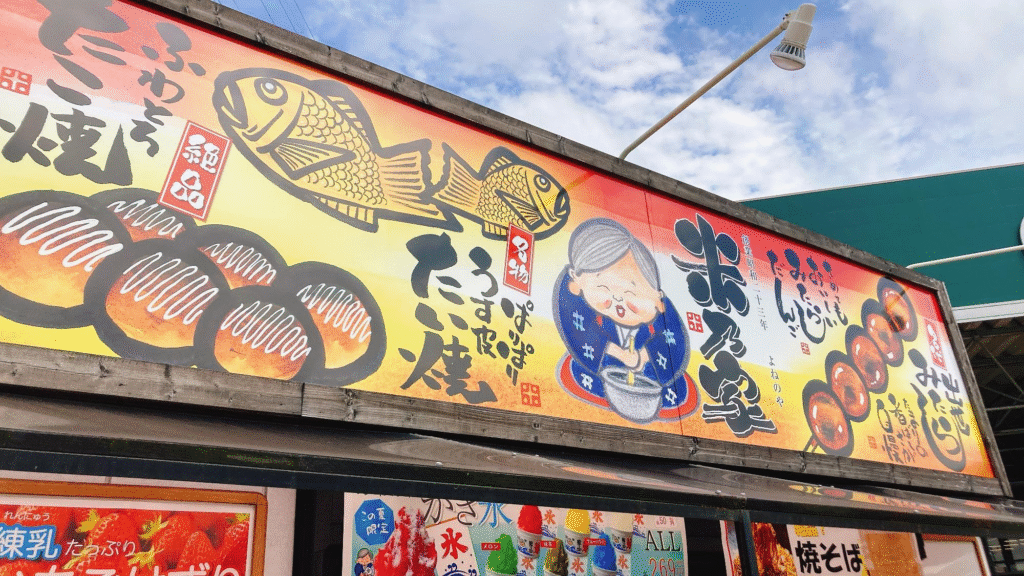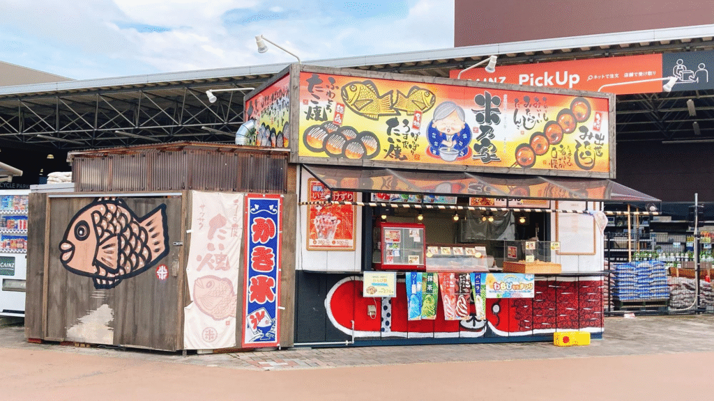 たこ焼き・たい焼き・お団子・わらび餅・ソフトクリーム・かき氷などいろいろな商品を販売している屋台のようなお店です。