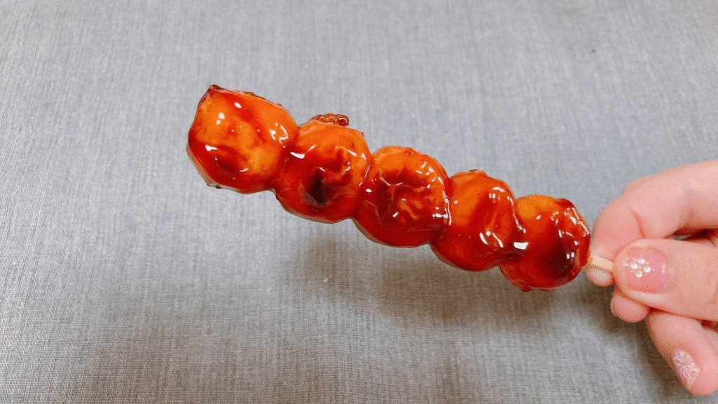 醤油感が強めの甘辛団子でお茶と一緒にいただきたいですね。