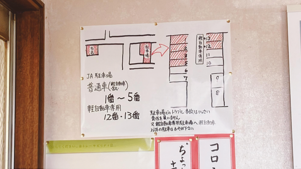 店の目の前の駐車場はお店のものではないですし、かなり道が狭いので車を寄せるのはおすすめしません。