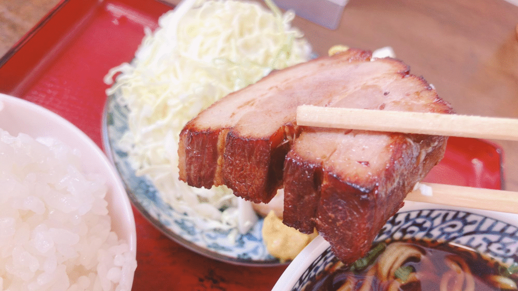 焼豚に添えられたキャベツとポテトサラダもてんこ盛りで、食べ応え抜群でした。